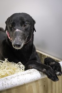 Condition when she arrived at Tia….Disgusting! stinks, damaged hock and strap marks from an anti bark muzzle.
