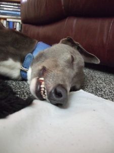 This lovely dog was bred and raced by the trainer and after a few minor, terrifying incidents, like the tv and toys…just look at him…He has adjusted to being in a home within weeks.