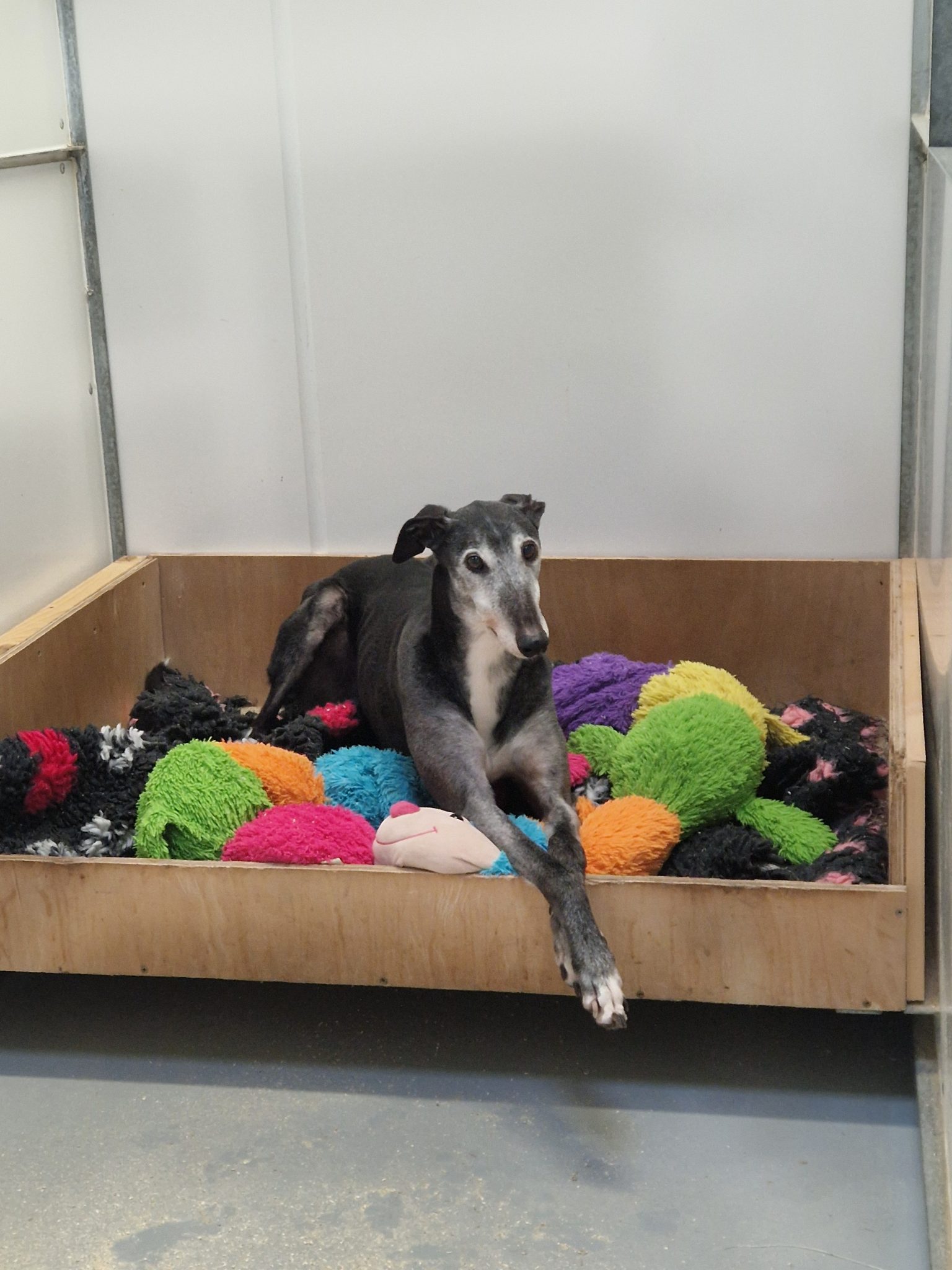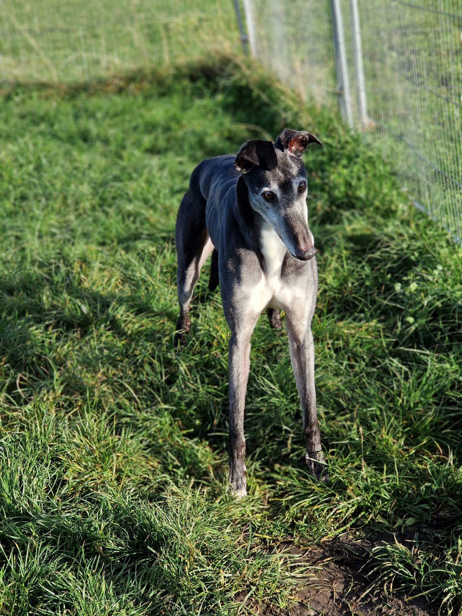 Fetched £1600 as a mere stripling. Never raced a GBGB track, just on the Independent circuit. He was given to Tia at just over 3 years old. A very, very nervous dog who won’t go anywhere, other than the paddocks.