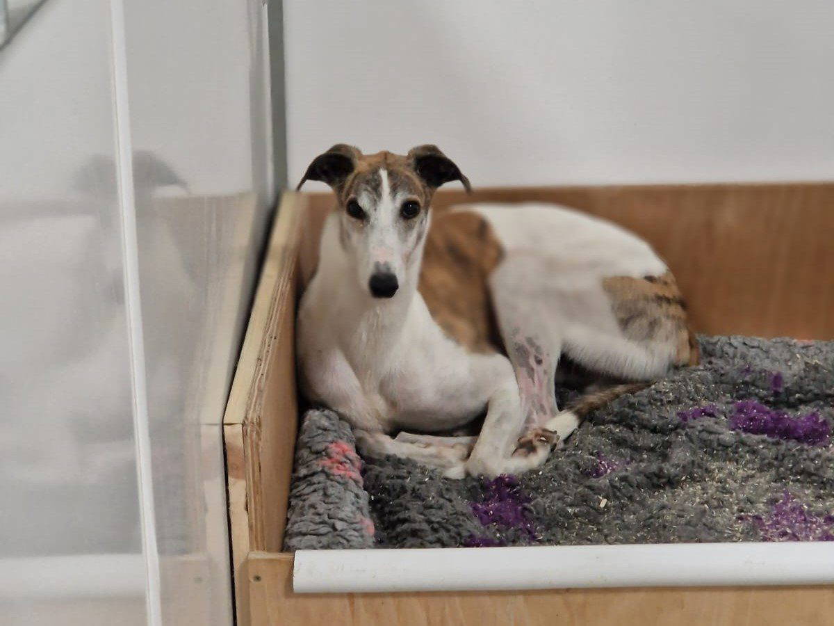 He sits firmly at the back of the kennel waiting for us to make a wrong move. A very nervous lad at the moment. One of the Lee Macmanus batch of nine we took in at the end of August 2024. He needs an experienced home, preferably with another dog but this boy must be kept safe and not let off his lead even in a secure paddock.