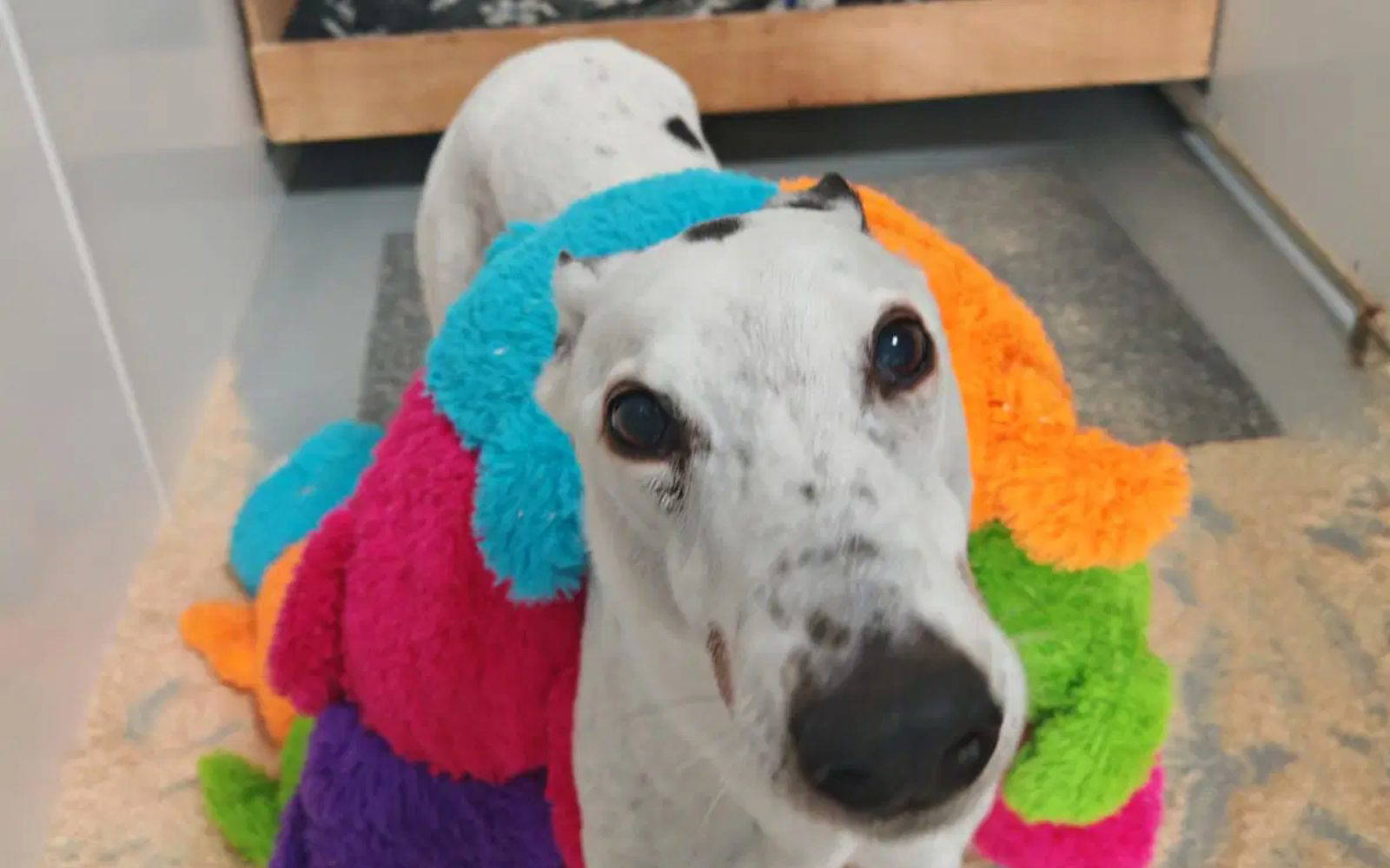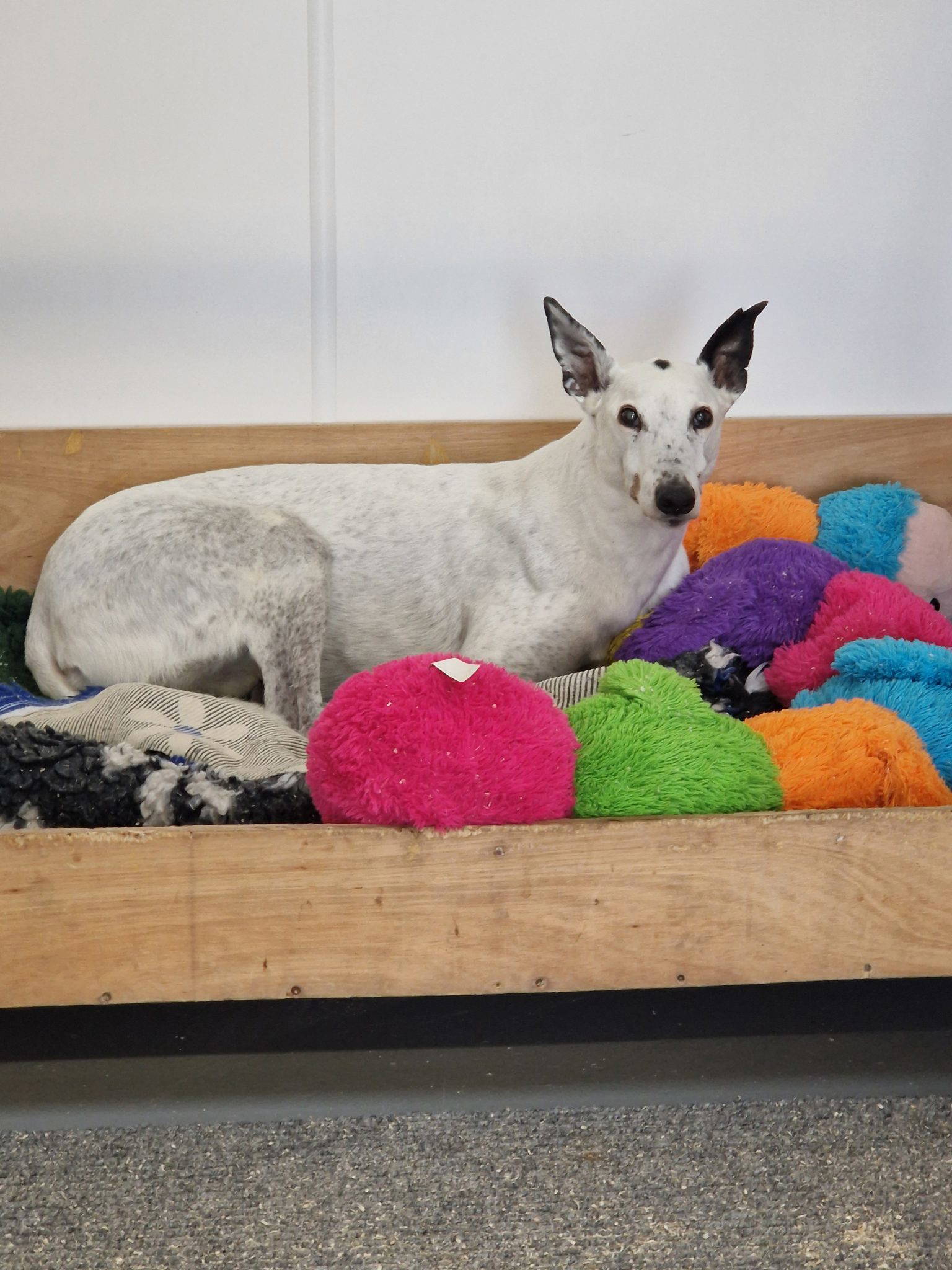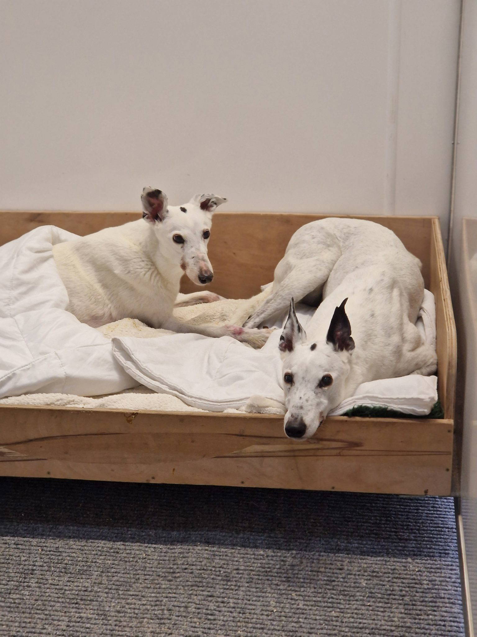 These two almost certainly ran at Askern flapping track. Having spent so long in the dark, they rely on each other and have to be re-homed as a pair. The staff have serious problems if they even lose sight of each other.