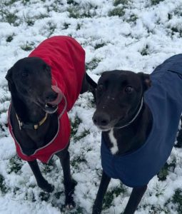 This greyhound was given the name SLIPPERS (red coat in photos). A few hours later we received a call from the dog warden regarding a second greyhound that had been pulled out the same canal