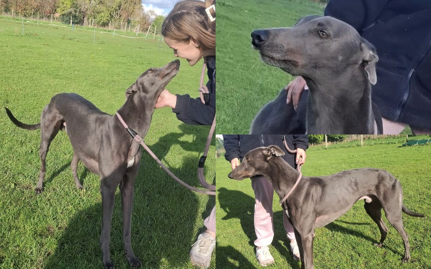 He’s handsome, he is friendly, he is playful, he is great on a lead, he comes to his name, he knows how to pose and he is loved by all at the kennels. Nelson has been retired early due to an injury and because of this the kennels have spent more time walking & playing with hiim and he is already well on his way to a household & sofa. On top of being super friendly and playful, he is very handsome with a blue coat and amber eyes. I have more photos of Nelson than anyone else as he’s a poser!