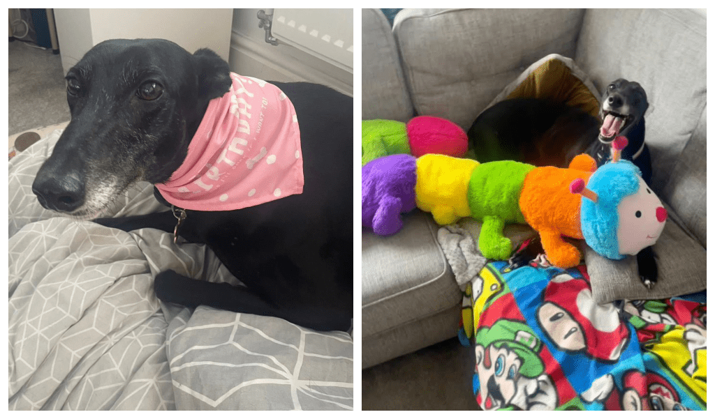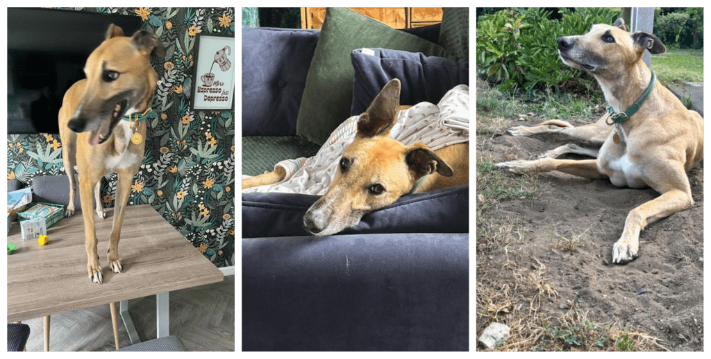 Bert (Otis/ Ruffian Han) was adopted at the end of May and has taken the saying, “he’s got his feet under the table” to a whole new level! His lovely new family tell us his favourite things are – sharing toast, being with his humans, laying in his patch of dirt when it’s warm and taking things to the garden… especially the duster! It sounds like Bert is loving his new life!