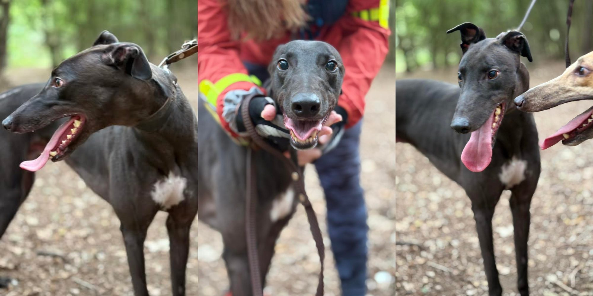 He’s a confident, happy go lucky boy so would probably be happy as an only dog or he could also happily live with another male or female Greyhound.